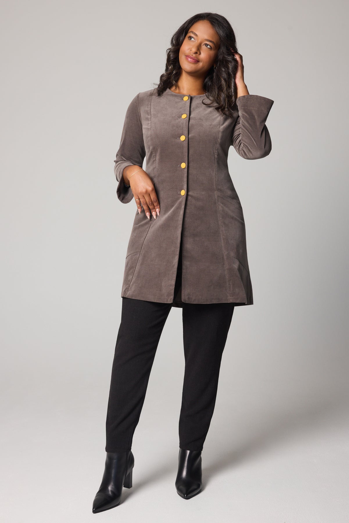 Mid-thigh length: 34–35 inches (the perfect swish factor)