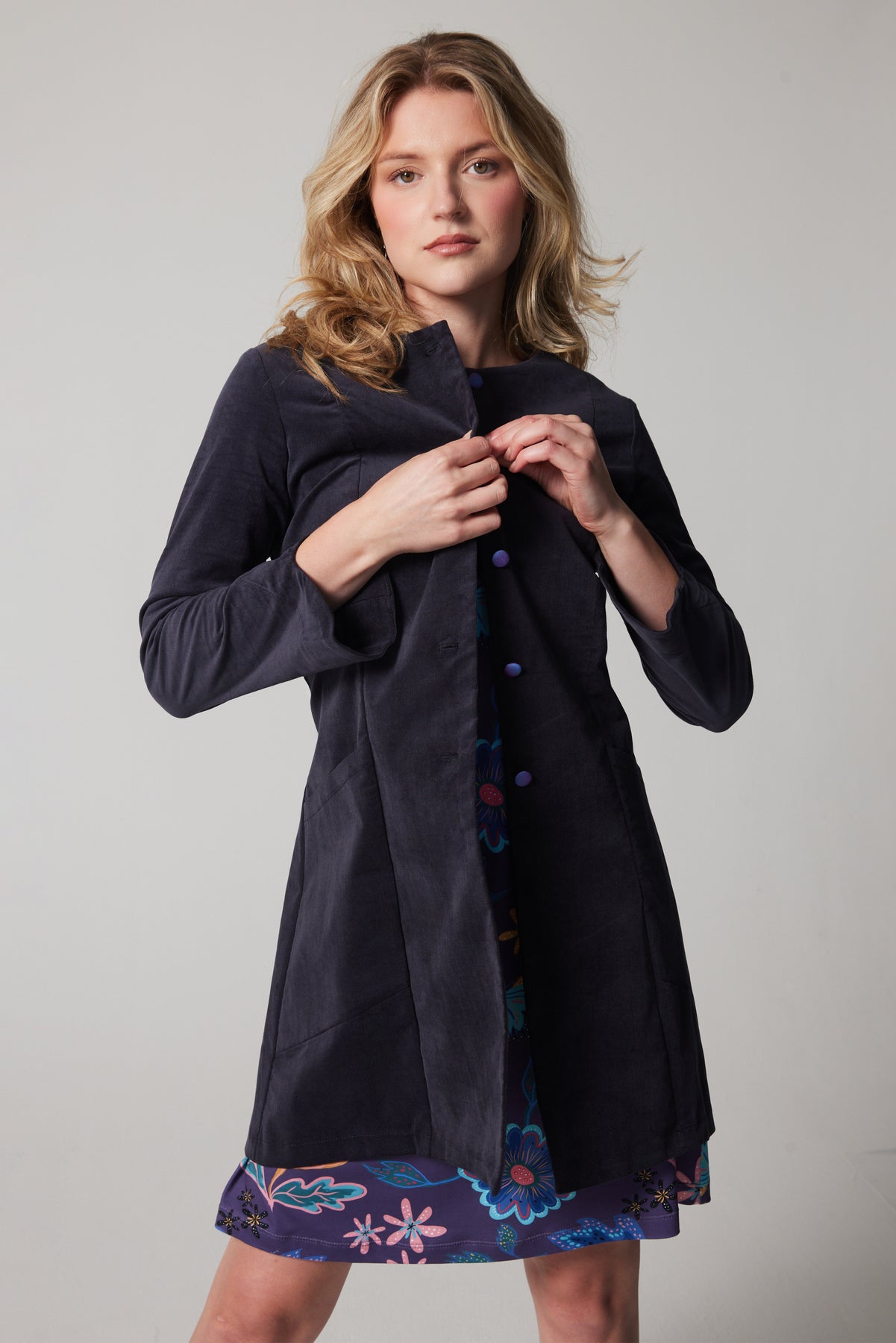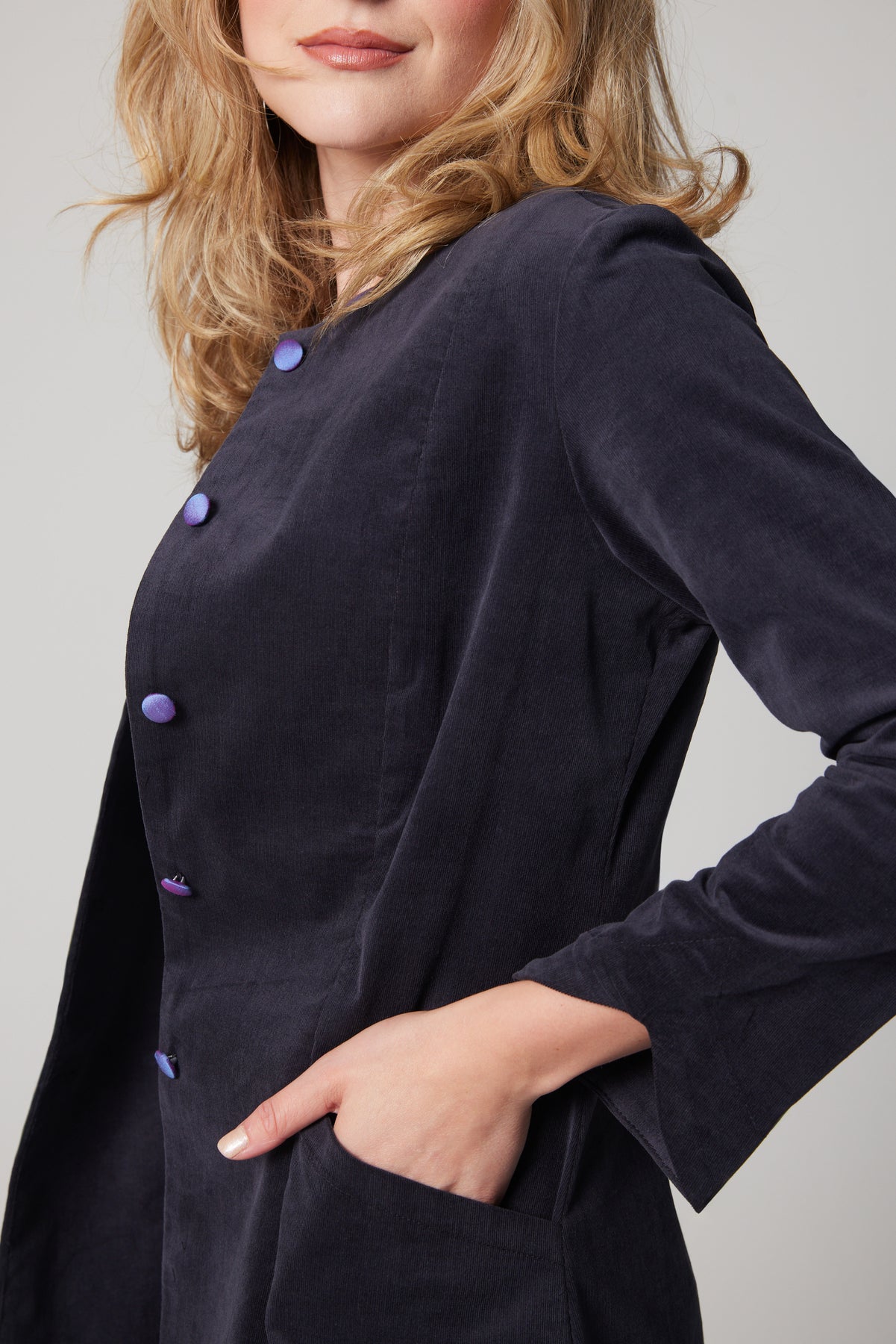 Cute collarless neckline & covered buttons